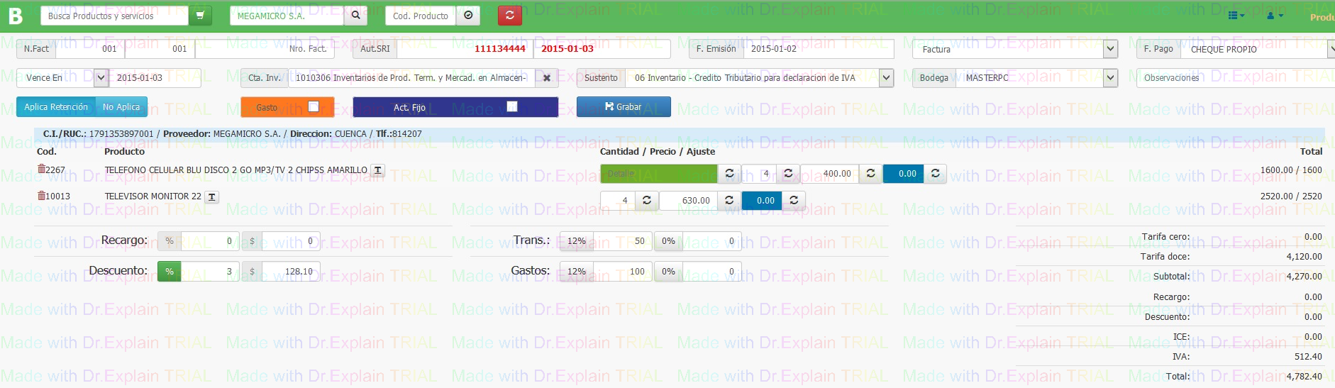Entre la parte inferior registra los descuento y recargos que pueda tener la factura , ademas tambien registra gastos extras que pueda tener una compra como un gasto extra de transporte u otros gastos los mimos que pueden ser deducibles o no deducibles de impuestos.