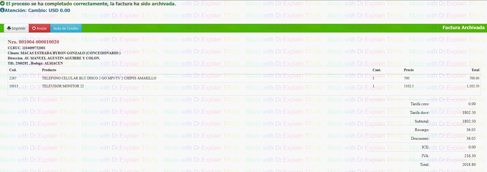 • Luego de Confirmar pago saldra un mensaje de archivado correcto y se manda a imprimir, ademas dependiendo de los privilegios que se tenga en el sistema podra anular la factura o hacer notas de credito de la misma