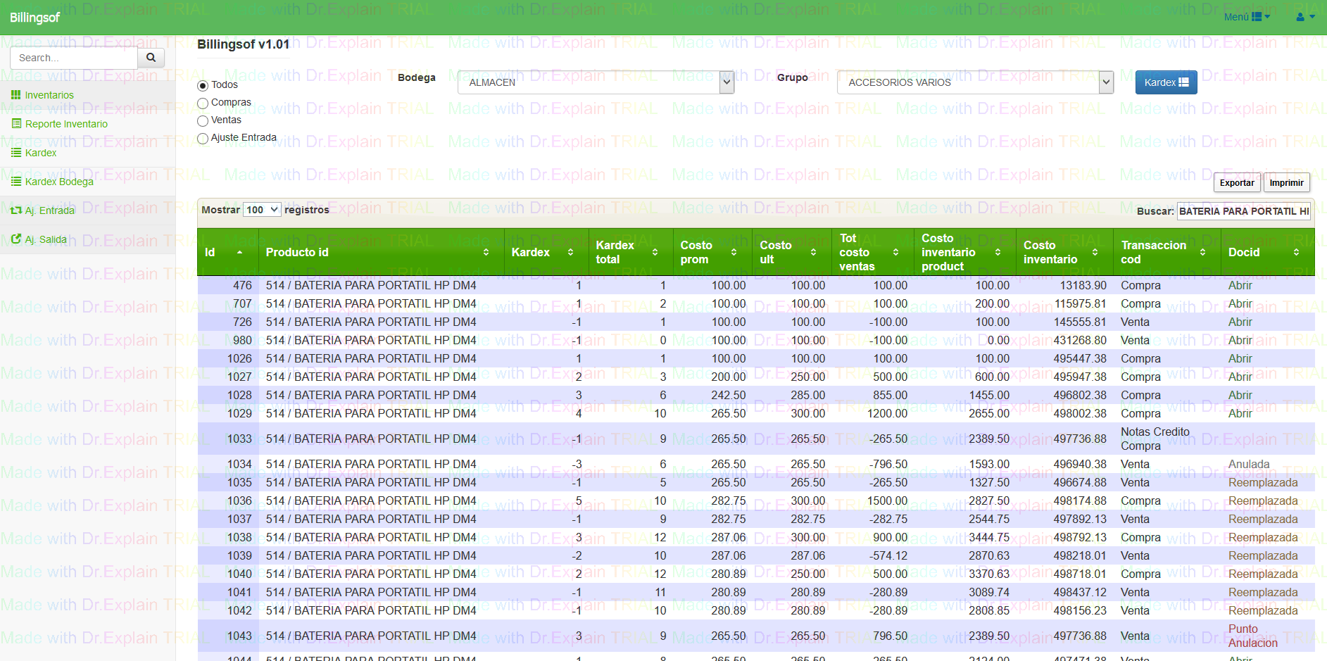 Luego de realizar los filtros de busqueda nos permite billingsoft revisar el kardex del inventario, muestra un historial de ENTRADAS Y SALIDAS de productos, con fechas y tipo de documento, tambien desde este mismo modulo podemos visualizar el docuemnto que se realizo.